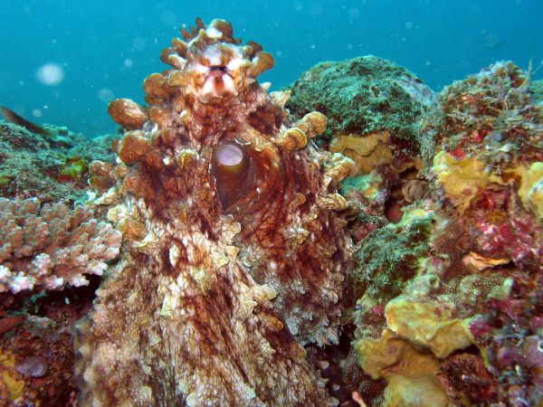 Die dritte Überraschung ist das beinahe komplette Fehlen von Korallen an vielen Tauch-Platzen. Ab und zu erhebt sich eine kleine Hirn- oder Pilz-Koralle, aber die meisten Strukturen sind tot. Gut, das stimmt nicht für alle Plätze. Am letzten Tag besuchte ich die Muiron Island, die etwa eine Stunde von Exmouth entfernt liegt. Hier gibt es jedem Menge und auch riesige Korallen, dafür gibt es viel weniger Fische.